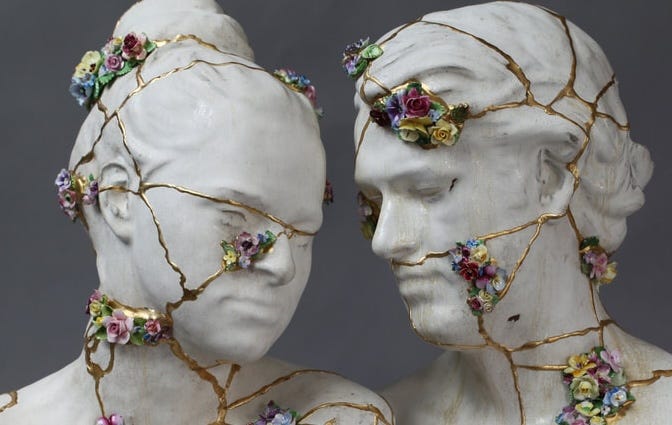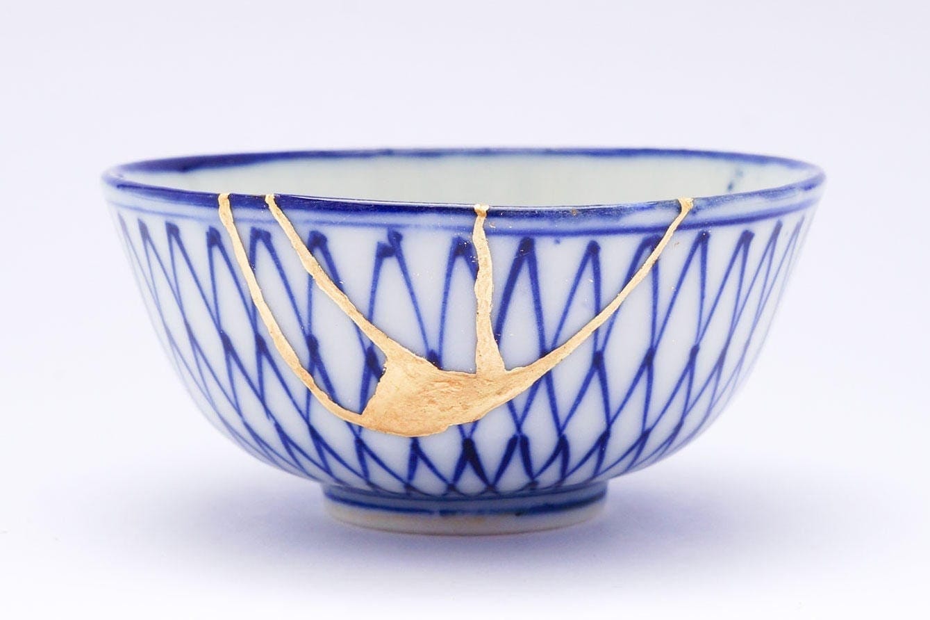 If you like the Japanese art of Kintsugi, meaning “golden joinery,” you might appreciate the beautification of brokenness. Kintsugi is the practice of making broken things beautiful by highlighting the cracks with shimmering seams instead of concealing them or throwing the pieces away. This idea of accepting imperfection, transience, and incompleteness is prominent in Buddhist philosophy and is known in Japan as “wabi-sabi.” It’s an interesting and frugal aesthetic choice, but not a good metaphor for human healing.