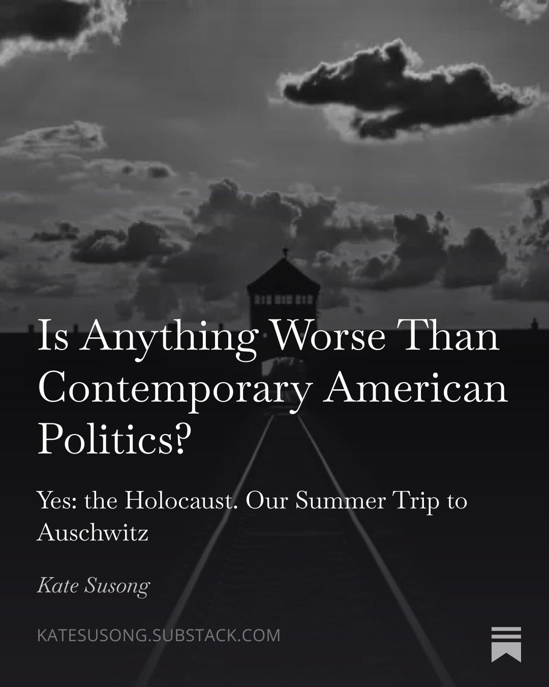 Until then, please enjoy this essay from the archives, “Is Anything Worse Than Contemporary American Politics? Yes: the Holocaust. Our Summer Trip to Auschwitz.” January 27, 1945 was the day that the Soviets liberated Auschwitz-Birkenau, the most notorious of the Nazi death camps. It’s worth remembering for many reasons: read on.