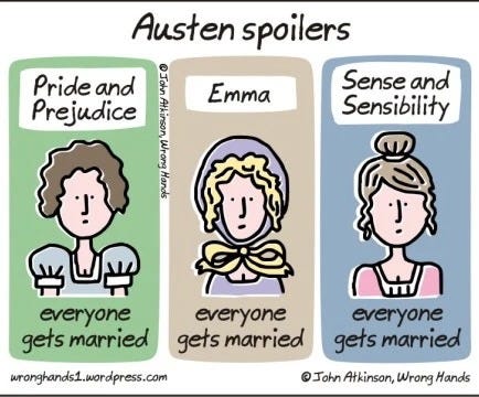 A: No need. All my stories can be enjoyed on their own, even by my husband who has read only Pride and Prejudice — at my insistence while dating more than 20 years ago. (He prefers Wittgenstein and Evelyn Waugh.) Each story stands alone — you can read one and just enjoy the sketch or read them from Vignette 1: “Tailgating Mr. Darcy” and see how the whole story develops. Each short is a 5-10 minute read, and all together, they make a serialized novella. If you’re an Austen fan, nerd out and let me know in the comments if there’s a favorite character whom you’d like to star in a story, and I’ll fit him in. I’ve also started chatting with subscribers here, so please join the conversation!